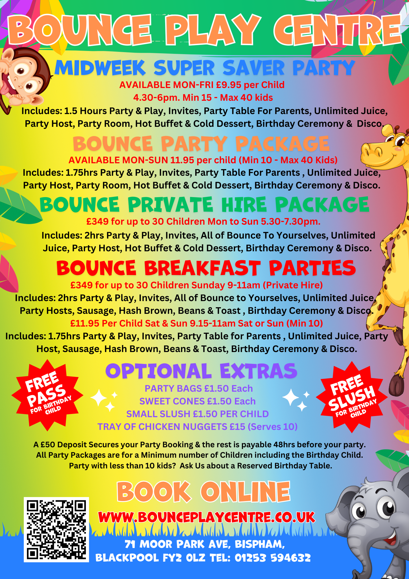 If you require any further information or would like to make a booking, call our friendly team today on 01253 594 632 or click the links below to book online. Alternatively you can send us an email to bounceplaycentre@gmail.com .